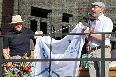 Am Samstag, 5. Juli, überreichte Dekan Rüdiger Schulze am Ende des Festgottesdienstes beim Chorfest Baden 2025 in Emmendingen eine Chorfest-Fahne an Schuldekan Stephan C. Thomas. Dieser wiederum übergab die Fahne am Sonntag, 6. Juli, an den Oberbürgermeister der Stadt Ettlingen, Johannes Arnold. Das Stadtoberhaupt hisste die Fahne beim Musikfestival feierlich am Schloss Ettlingen.
